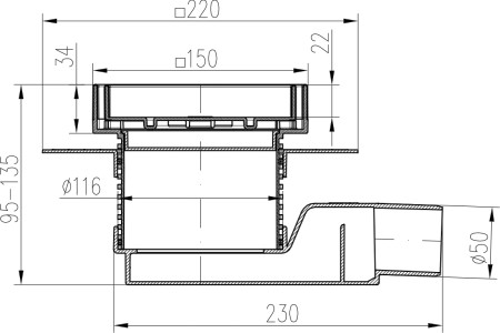 Floor drain-low with side outlet D50, collar, stainless steel frame, grid STEEL