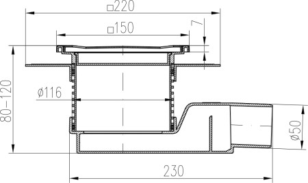 Floor drain-low with side outlet D50, collar, stainless steel frame, grid SUN