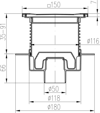 Floor drain with bottom outlet D50, NEPTUN, collar, stainless steel frame, grid SUN