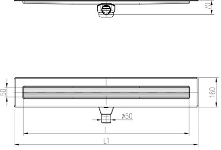 Stainless steel linear floor drain, 700mm, swivel side siphon D50