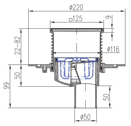 Drenaje de suelo, inferior negro D50, ala de acero inoxidable, rejilla FACE negro