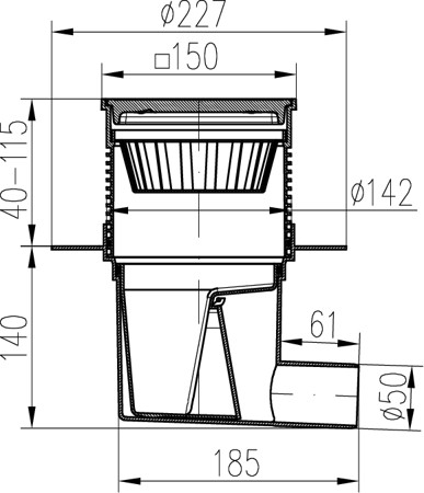 Kanalizační vpusť boční D50, suchá klapka, límec, litinová mřížka