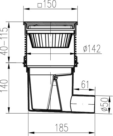 Kanalizační vpusť boční D50, suchá klapka, litinová mřížka