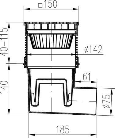 Kanalizační vpusť boční D75, vodní hladina, nerez mřížka