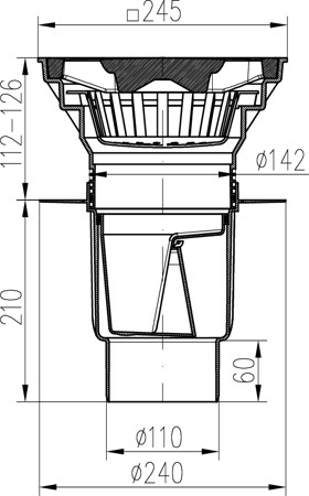 Kanalizační vpusť spodní D110-250 vodní hladina, límec, litinová mřížka