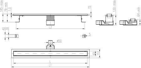 Lineární nerezový žlab 850 mm,boční D50,line mat