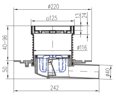 Vpusť je určena pro vnitřní a venkovní použití. Obsahuje suchou klapku a vodní hladinu. Vyrobeno z PP, PS a nerezové oceli DIN 1.4301. Zatížení K3-300 kg, odolnost do 90°C, zkoušeno dle normy EN 1253.