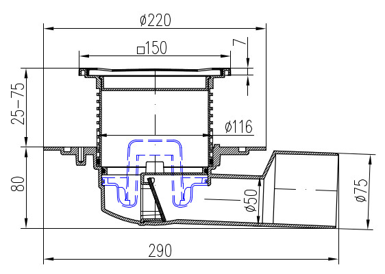 Vpusť je určena pro vnitřní a venkovní použití. Obsahuje suchou klapku a vodní hladinu. Vyrobeno z PP, PS a nerezové oceli DIN 1.4301. Zatížení K3-300 kg, odolnost do 90°C, zkoušeno dle normy EN 1253.