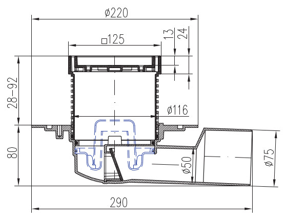 Vpusť je určena pro vnitřní a venkovní použití. Obsahuje suchou klapku a vodní hladinu. Vyrobeno z PP, PS a nerezové oceli DIN 1.4301. Zatížení K3-300 kg, odolnost do 90°C, zkoušeno dle normy EN 1253.