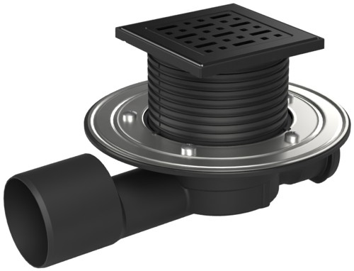 Vpusť je určena pro vnitřní a venkovní použití. Obsahuje suchou klapku a vodní hladinu. Vyrobeno z PP, PS a nerezové oceli DIN 1.4301. Zatížení K3-300kg, odolnost do 90°C, zkoušeno dle normy EN 1253. Černá nerezová mřížka 1,5 mm je opatřena polyesterovou termosetickou barvou.