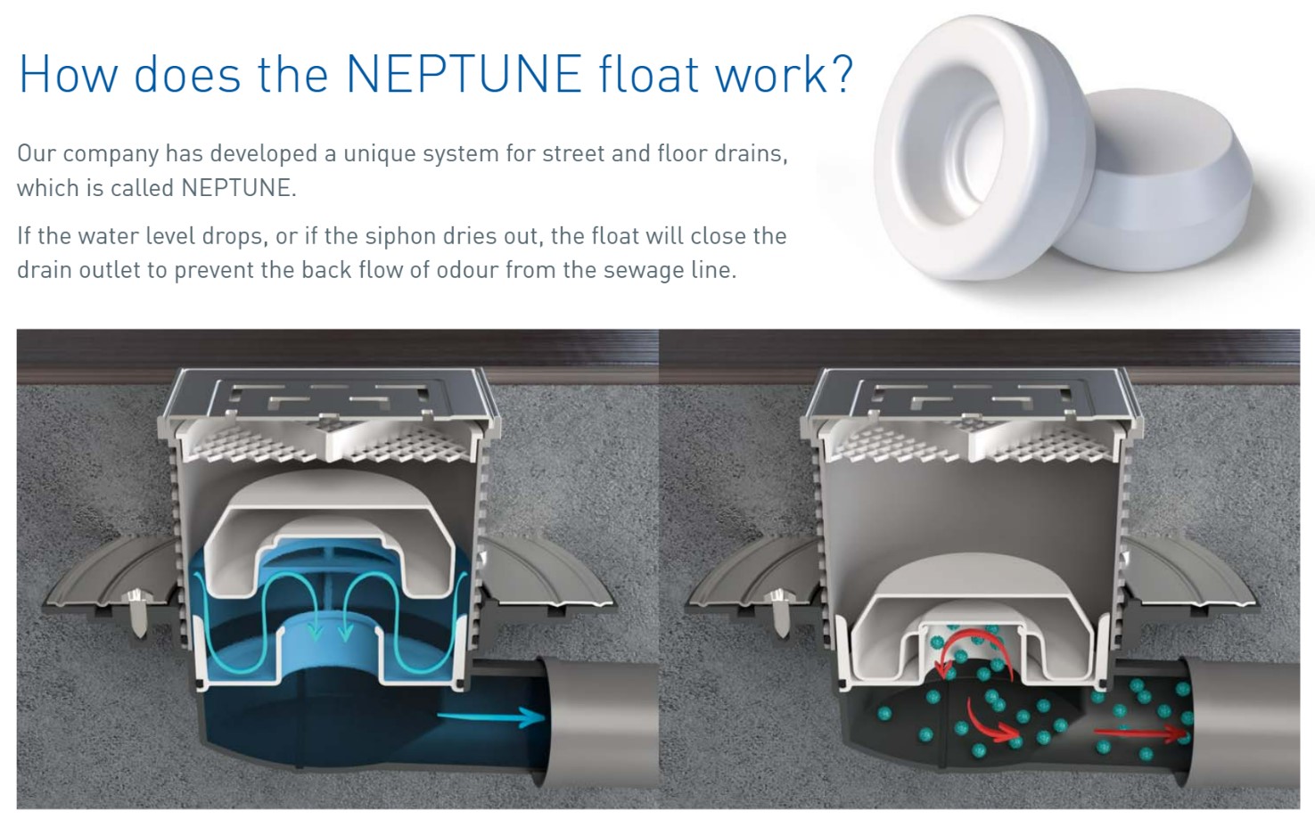 Při poklesu vodní hladiny plovák NEPTUN uzavírá odtok a tím zabraňuje zpětnému pronikání zápachu z kanalizačního potrubí. Vyrobeno z PP, PS a nerezové oceli DIN 1.4301. Zatížení K3-300 kg, odolnost do 70 °C, zkoušeno dle normy EN 1253.