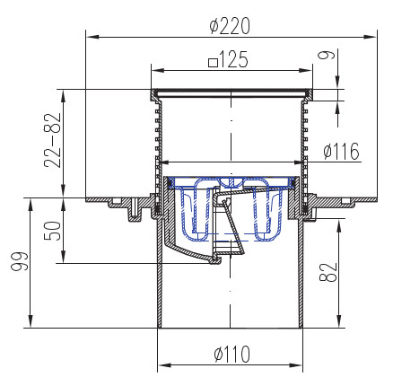 Vpusť je určena pro vnitřní a venkovní použití. Obsahuje suchou klapku a vodní hladinu. Vyrobeno z PP, PS a nerezové oceli DIN 1.4301. Zatížení K3-300kg, odolnost do 90°C, zkoušeno dle normy EN 1253. Černá nerezová mřížka 1,5 mm je opatřena polyesterovou termosetickou barvou.