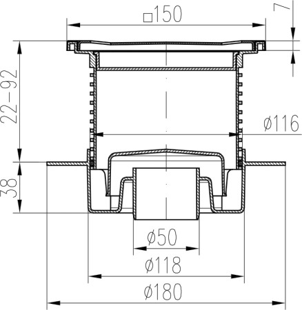 Podlahová vpusť spodní D50, límec, nerez rámeček, mřížka SUN